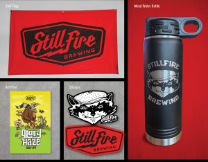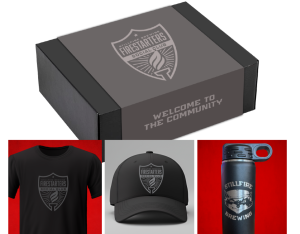 - Introductory Swag Pack including: FireStarters Social Club metal membership card, t-shirt, beer koozie, hat, and car magnet, StillFire Brewing logo 3’x4’ flag, metal water bottle, art print and stickers.